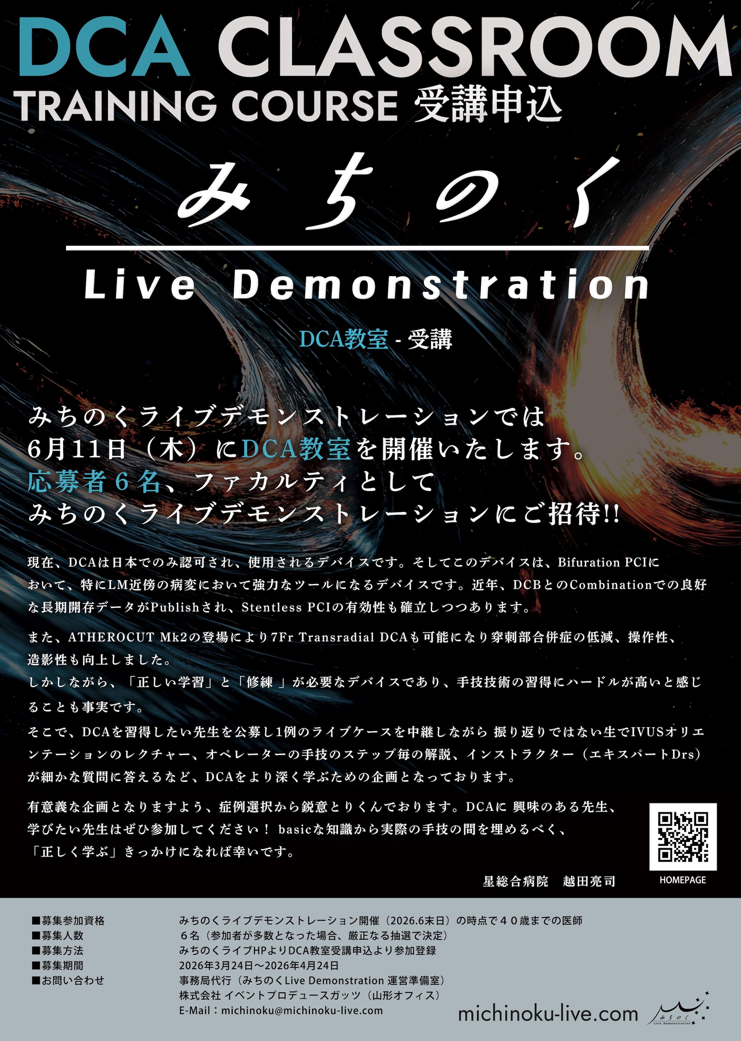 そこで、DCAを習得したい先生を公募し1例のライブケースを中継しながら振り返りではない生でIVUSオリエンテーションのレクチャー、オペレーターの手技のステップ毎の解説、インストラクター(エキスパートDrs)が細かな質問に答えるなど、DCAをより深く学ぶための企画となっております。